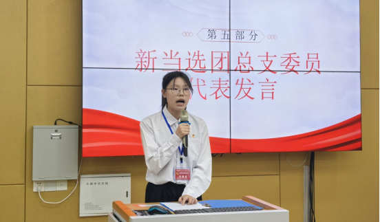 随后进入换届选举环节。大会选举经过充分酝酿筹备,严格按照选举流程,采用无记名投票的方式,差额选举产生了第四届团总支委员。新当选团总支委员代表罗欣上台发言,她表示将不负重托,继续发扬团总支的优良传统,团结带领全体团员青年,锐意进取,勇于创新,为学院的发展和青年学生的成长成才贡献力量。