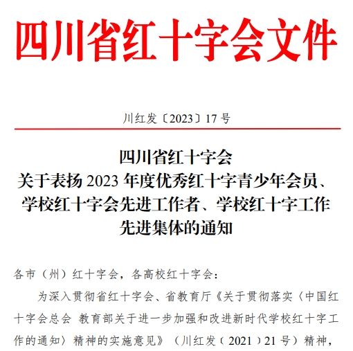 临床医技学院副院长刘孝桢荣获四川省红十字会2023年度“学校红十字会先进工作者”称号,21级临床4班谢金龙荣获四川省红十字会2023年度“优秀红十字青少年会员”称号!