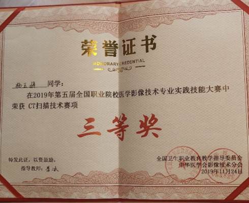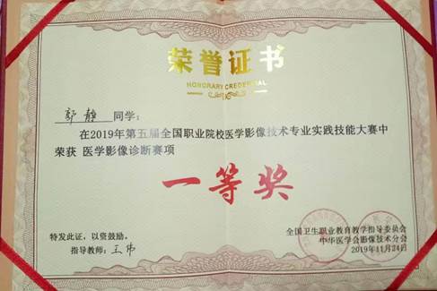 11月22-24日,我院医学影像系杨玉婷、郭静、刘丹丹、雷欢四名学生同领队影像系副主任秦志刚、指导教师李冰、黄政、缪洁赴山东参加第五届全国职业院校医学影像技术专业实践技能大赛,并从全国62支医药卫生类职业院校队伍中脱颖而出,取得优异成绩。其中,郭静同学以总排名第二的优异成绩获医学影像诊断组赛项一等奖,杨玉婷同学获CT扫描技术赛项三等奖。在本届比赛影像学子首次在国赛中获得一等奖,为学院和影像系争得荣誉。