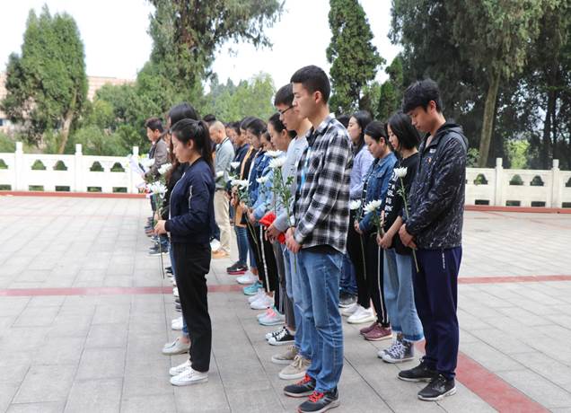 在烈士纪念碑前,支部党员和学生代表怀着沉痛的心向烈士默哀。随后教师龙飘、王栋梁对烈士在解放战争中浴血奋战、不怕牺牲的光荣历史进行详细讲解,追忆革命先辈的高尚情怀,在场每一位同志都为之动容,同时袁心愿同学也是有感而发,表达了青年学生对革命先烈的感激之情。最后,全体向烈士们献上手花。