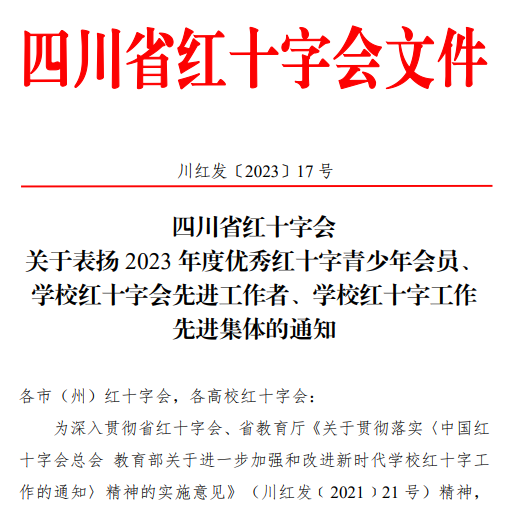 喜报:临床医技学院2021级临床4班学生谢金龙荣获四川省红十字会2023年度“优秀红十字青少年会员”称号。