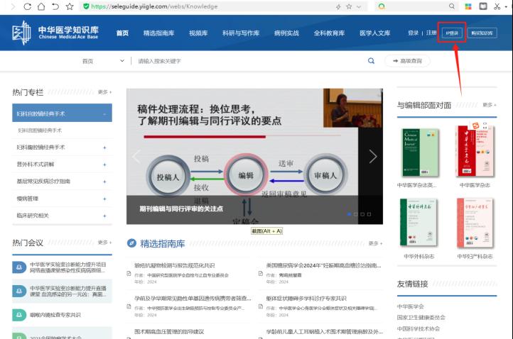 在校园内进入首页:http://seleguide.yiigle.com/webs/Knowledge,点击右上角IP登录,即可使用