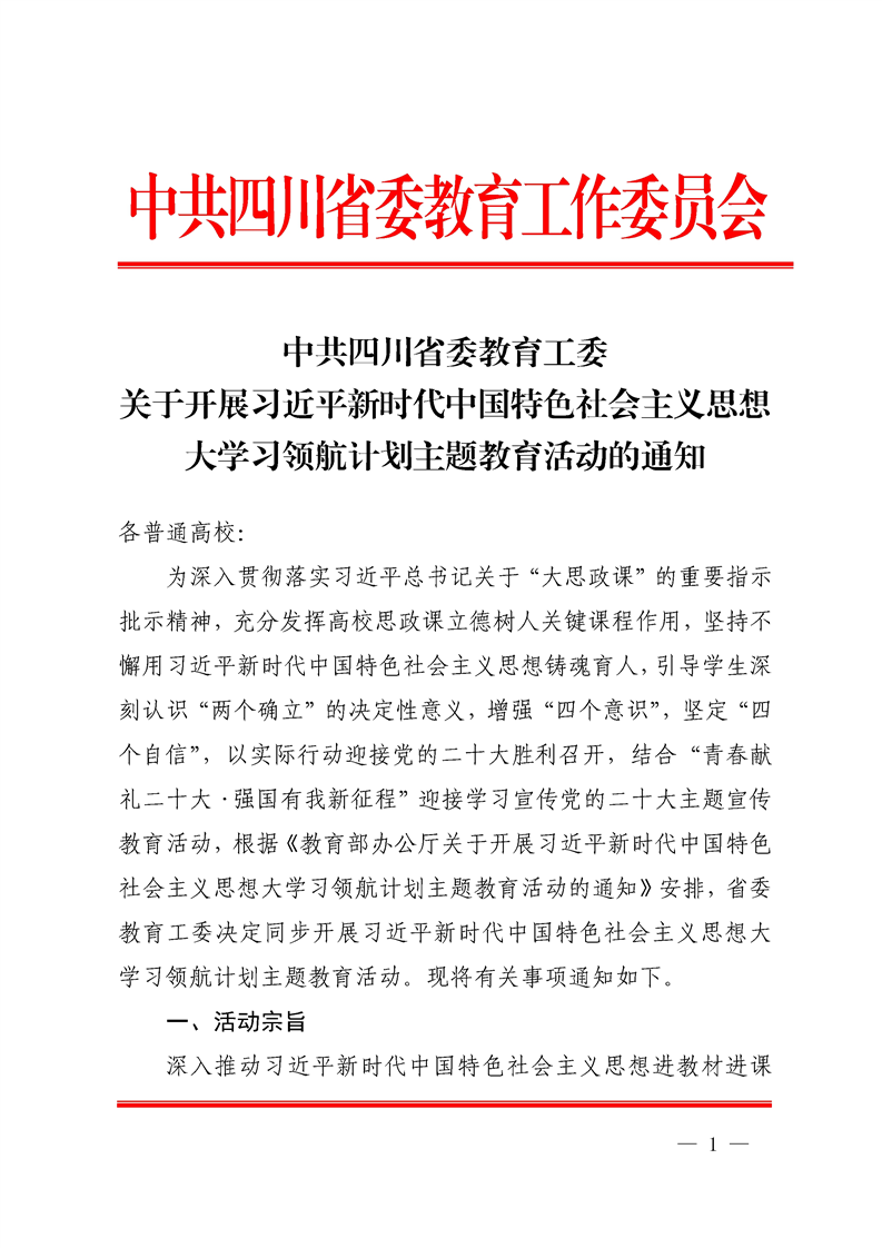 中共四川省委教育工委关于开展习近平新时代中国特色社会主义思想大学习领航计划主题教育活动的通知
