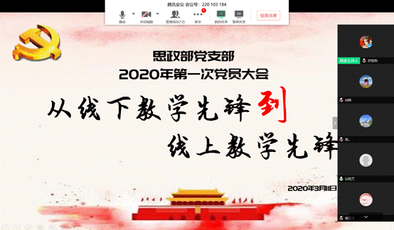 为提升各位党员教师对线上教学的重要性、必要性和艰巨性的认识,充分发挥党员示范作用。2020年3月11日,思政部党支部通过“腾讯会议”APP线上形式开展了主题为“从线下教学先锋到线上教学先锋”的党员大会。思政部党支部全体党员教师参加此次会议。