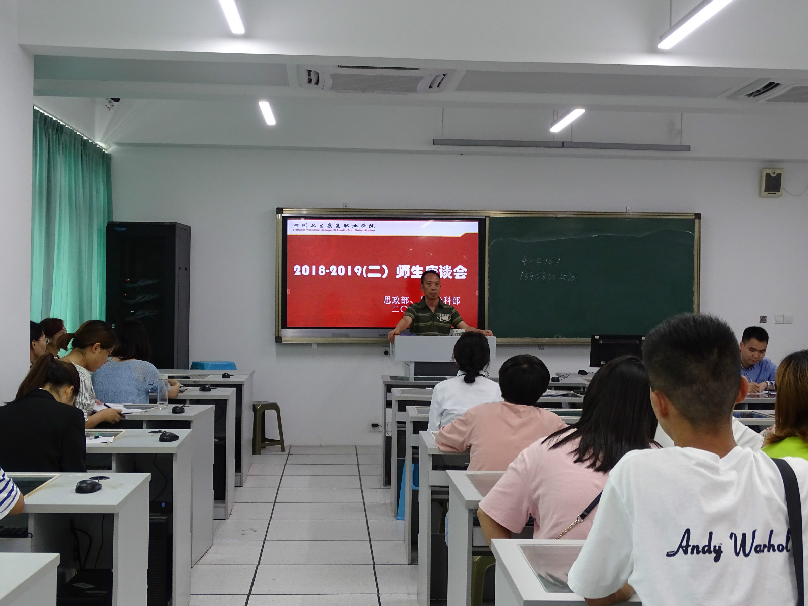 6月12日下午,思政部和人文社科部在4-C605联合举办师生座谈会。人文社科部副主任马应安、两系部教学干事、教研室主任、教师代表及2018级各班学生代表50余人参加了座谈会。会议由思政部副主任罗智凯主持。