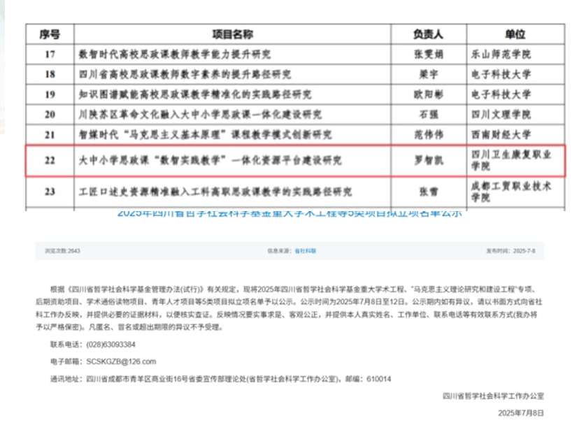 近日,2025年度四川省哲社科基金“马克思主义理论研究和建设工程”(“马工程”)专项立项名单正式公布,taptap点点马克思主义学院副院长罗智凯申报的课题《大中小学思政课“数智实践教学”一体化资源平台建设研究》成功获批立项。