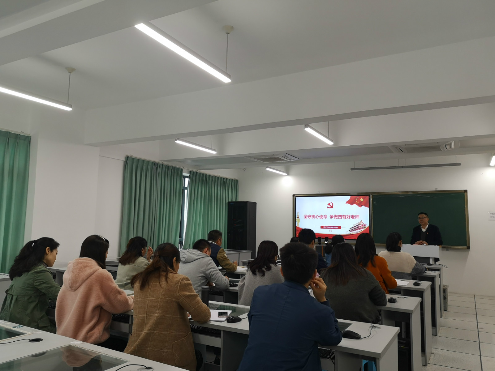 为落实学院“不忘初心 牢记使命”主题教育相关要求,学院副院长申奎于10月25日下午在4—C601为思政党支部及人文社科党支部讲授 “坚守初心使命 争做四有好老师”的专题党课。两个支部的党员共30余人参加。