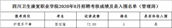 我院于2020年9月8日发布了《学院2020年8月招聘拟录用人员名单公示》,其中1名公示人员放弃入职,根据学院《关于开展2020年8月招聘现场考核的通知》相关要求,经9月22日院长办公会研究决定,按照考核成绩名次及公布的招聘岗位数,拟递补彭世隆进入体检环节,现予以公告(详见附件)。请递补进入体检环节人员按照9月2日《学院2020年8月招聘工作人员考核成绩及体检入围名单公告》要求做好相关工作,并于2020年9月29日前提交体检报告。