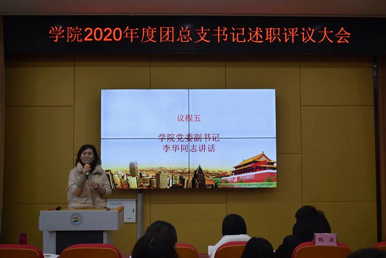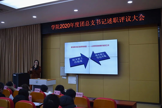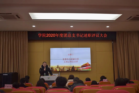 1月20号,学院团委在我院1-B403举行了2020年度团总支书记述职评议大会。学校党委副书记李华、党委办公室副主任王剑云、学工部副部长陈余梅、教工团支部书记、人事处副主任李俊龙、思政部党支部常务副书记秦丹、各系团总支书记、委员和青年师生代表参加会议。校团委副书记王庆主持会议。