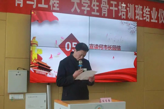 学院副院长黄昌平宣读了何树平市长给同学们的回信,何市长平易近人的话语和殷切的期望,让师生更添干劲和信心,同时也进一步激发青马学员们勇担时代重任,学好本领,增长才干,励志成长报效家乡。