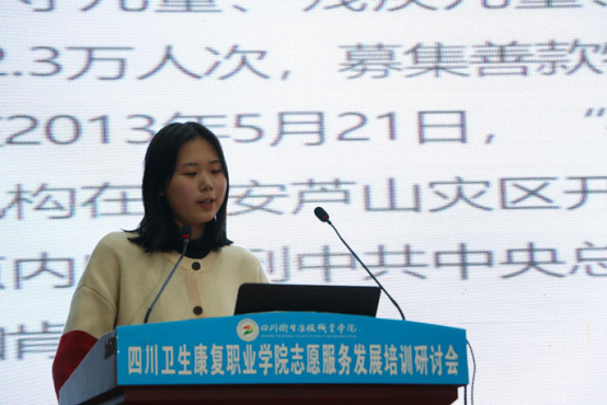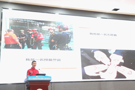 来自四川警察学院和自贡市灵犀义工联合会两个志愿服务组织分别就消防应急救援和事实无人抚养儿童两个志愿服务项目做了现场分享。