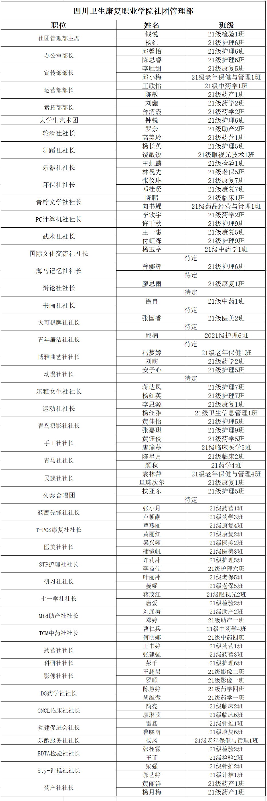 校团委学生组织换届选举录取名单