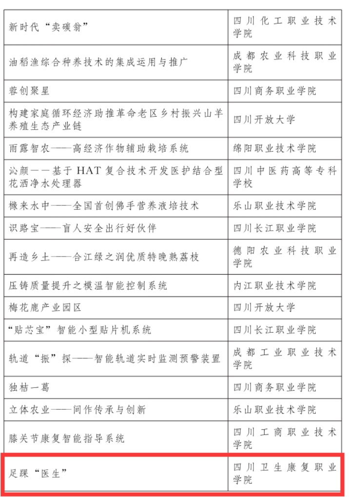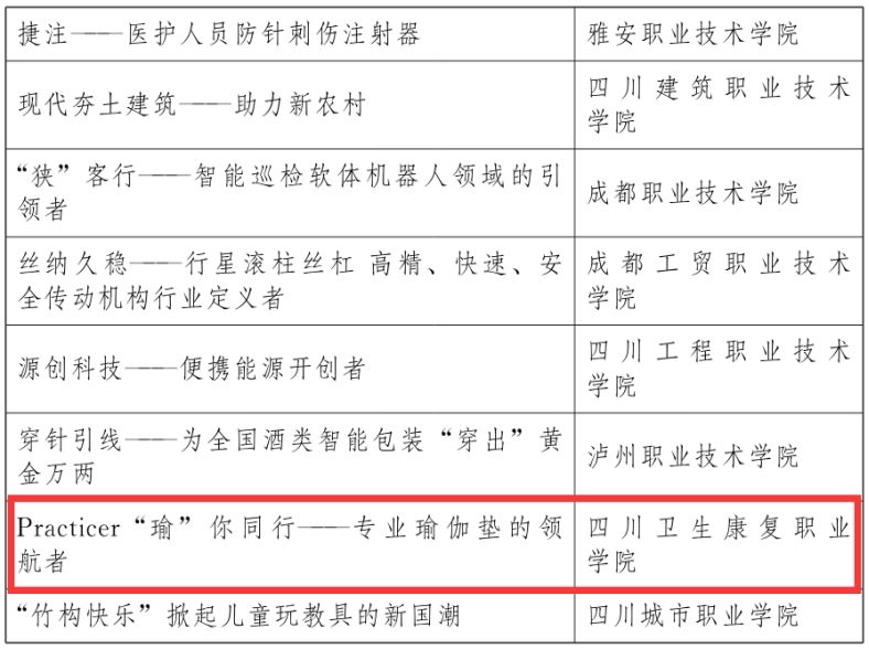 第二届四川省中华职业教育创新创业大赛获奖的通报中,我院参赛作品荣获高职组二等奖1项(教育体育学院作品,全省12个)、三等奖1项(教育体育学院作品,全省32个)、优秀奖1项(康复学院作品),最佳人气奖1项(《Practicer “瑜”你同行——专业瑜伽垫》排名全省高职人气第一)。