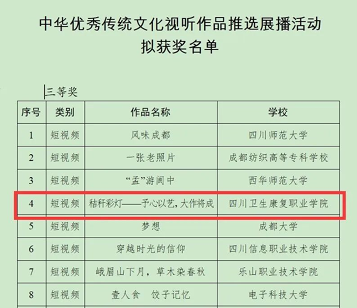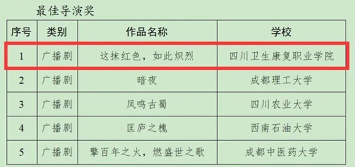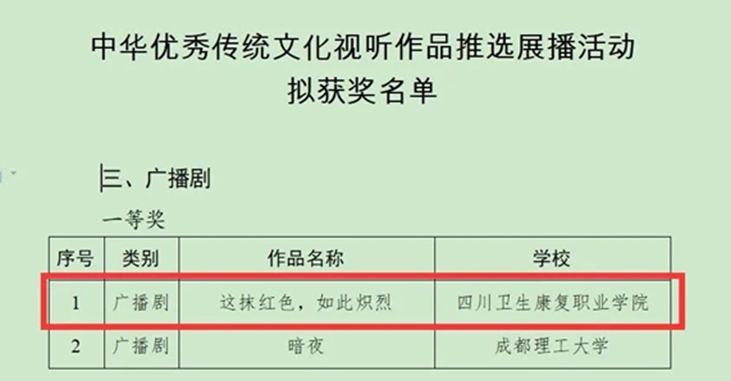 经学校推荐、专家评审、部门会商等环节,由中共四川省委教育工委、 四川省教育厅、中共四川省委宣传部 、中共四川省委网络安全和信息化委员会办公室、共青团四川省委员会举办的中华优秀传统文化视听作品推选展播活动获奖情况新鲜出炉。taptap点点作品《这抹红色,如此炽烈》获广播剧组一等奖,同时该剧导演获最佳导演奖(校团委指导);taptap点点作品《秸秆彩灯——予心以艺,大作将成》获短视频组三等奖(教育体育学院指导);学校获得优秀组织奖。