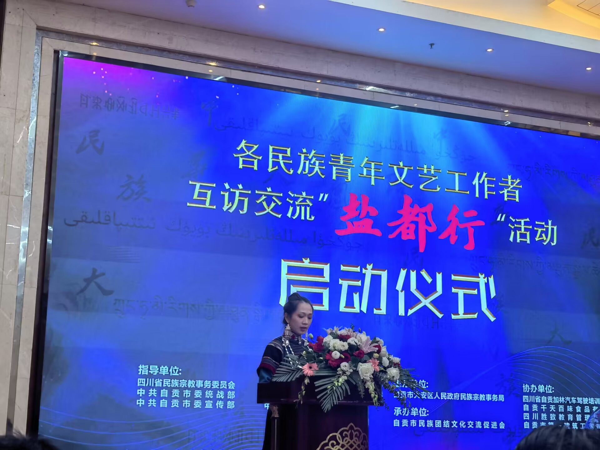 为全面深入学习贯彻党的二十大精神,以铸牢中华民族共同体意识为主线,促进各民族交往交流交融,推动民族文化文艺繁荣发展,持续推进基层民族团结进步创建工作,11月16日,各民族青年文艺工作者互访交流“盐都行”活动在自贡启动。省民族宗教委二级巡视员蔡钦,自贡市委常委、统战部部长吴进学出席启动仪式并致辞。我院学生工作部副部长刘明洋,团委委员毛启平,民族文化交流社社长袁林萍等30名师生文艺青年代表参加启动仪式暨新时代民族文化文艺发展交流论坛。