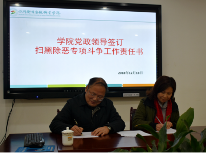 为认真贯彻落实党中央、省、市关于开展扫黑除恶专项斗争工作的部署要求,深入扎实推进我院扫黑除恶专项斗争工作,12月18日下午,在学院1教学楼A502会议室,学院党委书记刘建辉与学院党委成员签订扫黑除恶专项斗争责任书,学院党政领导自觉与黑恶势力划清界限,推动扫黑除恶专项斗争不断深入。