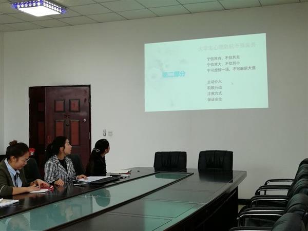 为总结和反馈我院2017年心理普查的筛查结果,有效落实下一步心理健康教育工作,学生工作处心理健康教育中心于11月10日15:00在一会议室组织召开了本学期第二次心理健康教育咨询例会,各系部干事、部分专兼职心理咨询老师参加了此次会议。