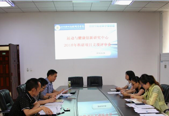 5月29日下午,自贡市哲学社会科学重点研究基地运动与健康创新研究中心2018年度科研项目立项评审会在学院一会议室举行。会议由科研处负责人伍勇主持,中心主任马应安、副主任吴小彩、学院科研指导委员会委员及科研工作人员参加本次会议。