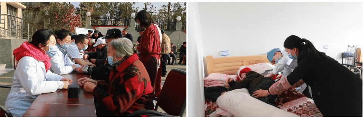 在仲权镇敬老院,志愿者们穿上红马甲和白大褂,开始了今天的志愿服务活动。其中,一队志愿者一边负责询问老年人病情,为老人们查体、阅读报告、测量血压、解答疑问,并对有需要的老年人开具处方。一边对老年人的不良生活习惯进行科普,并为长期卧床的老人开展卧床相关问题的指导及护理。