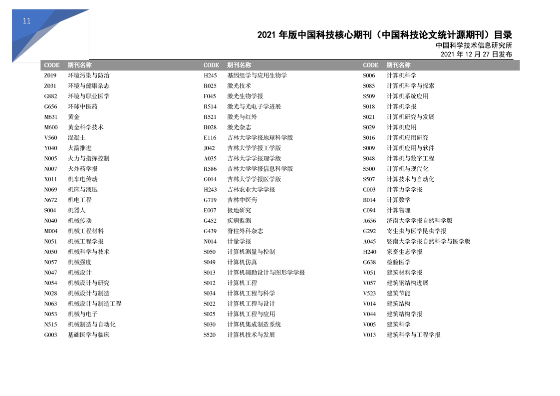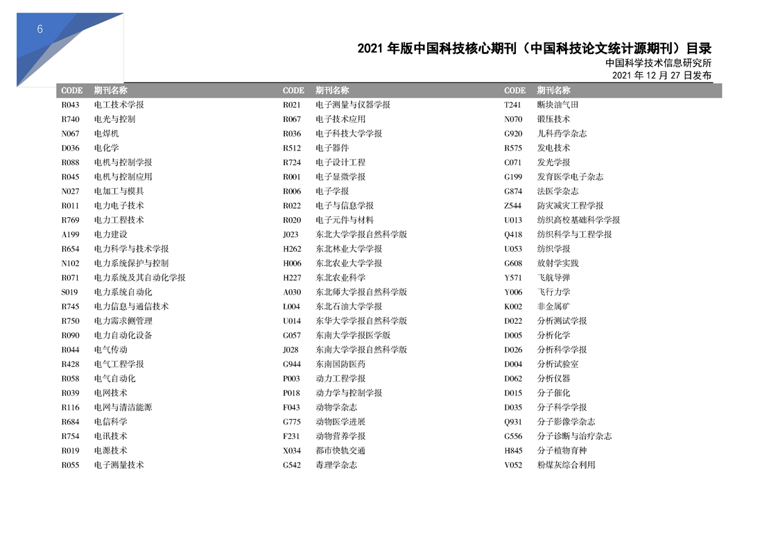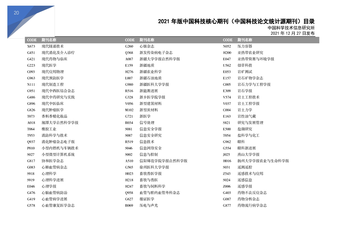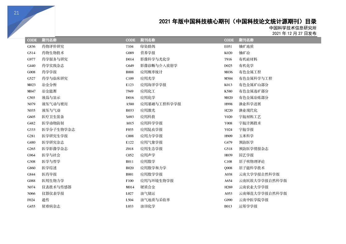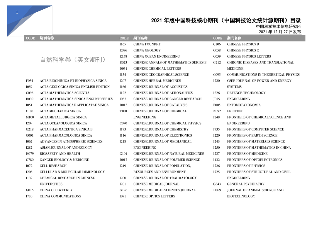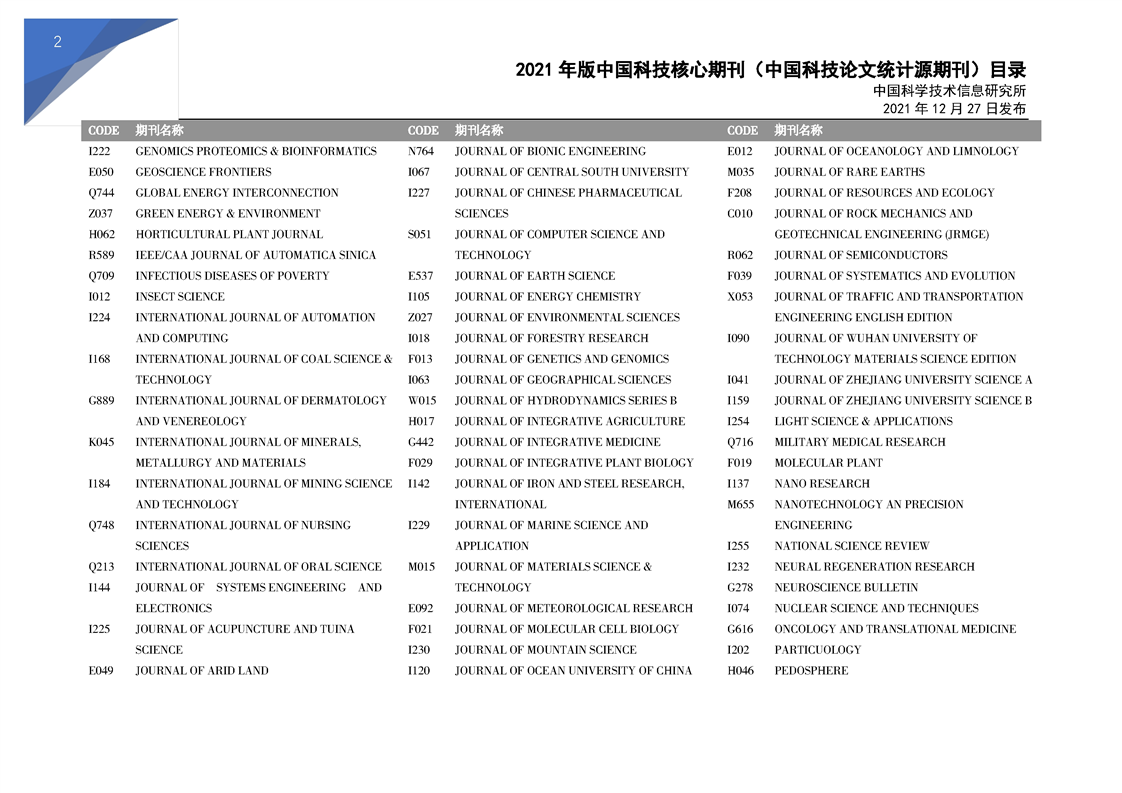 2021版科技核心期刊目录