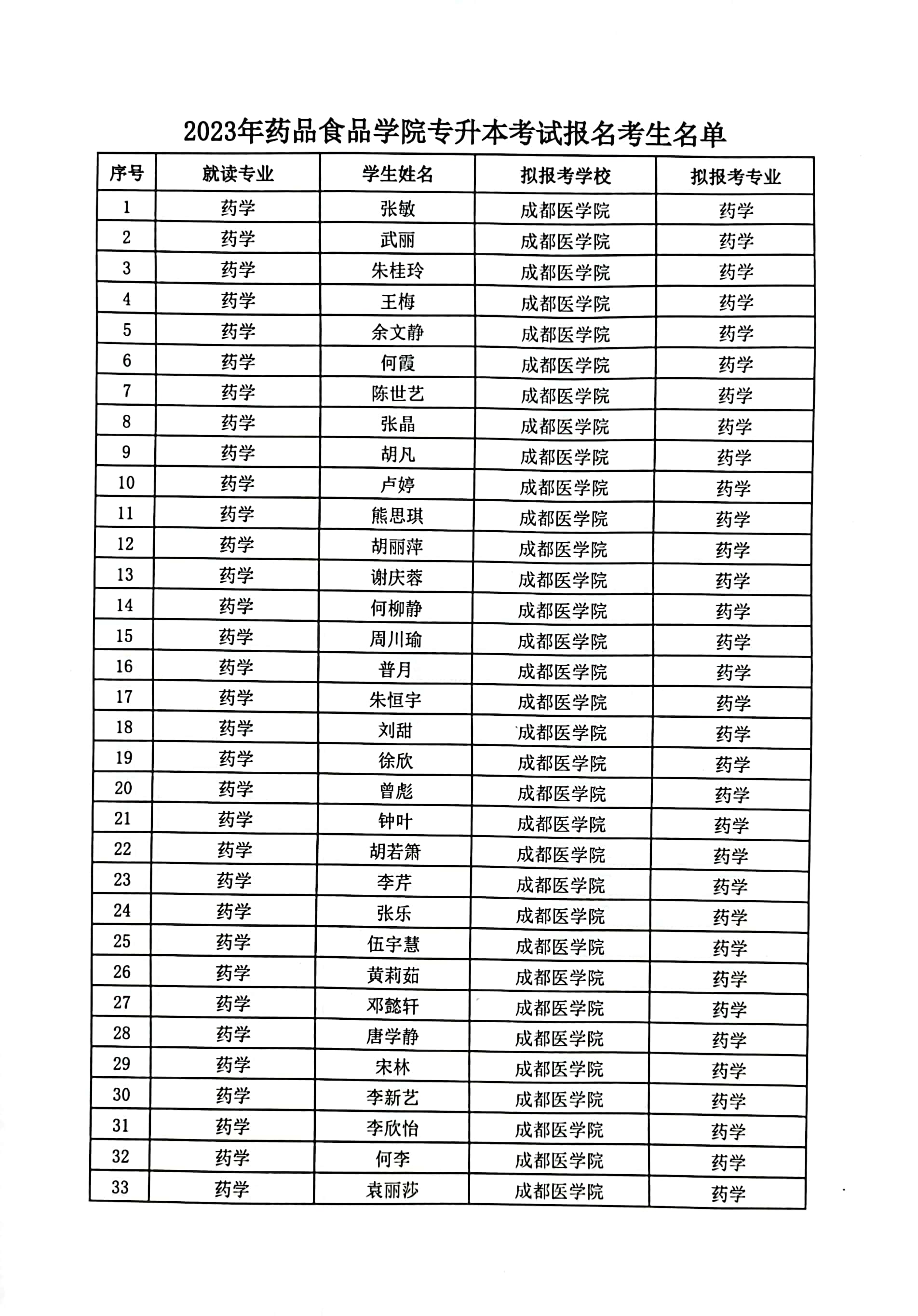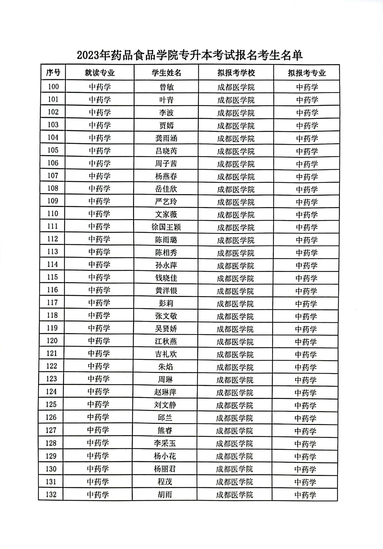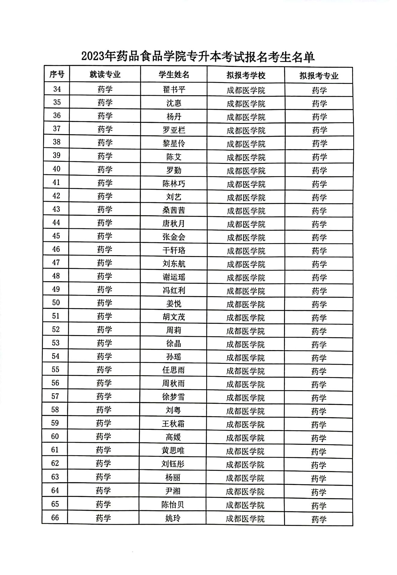 2023年药品食品学院专升本考试报名考生名单公示