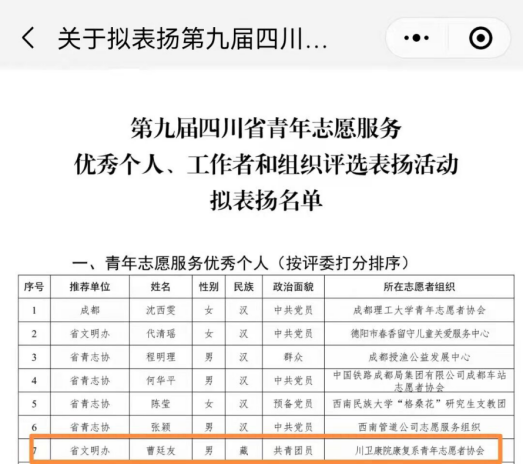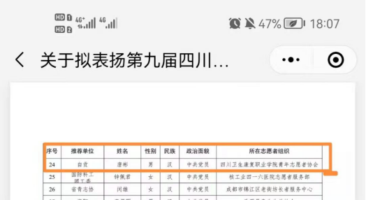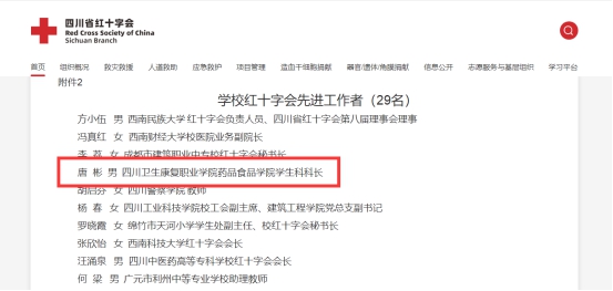 近日,药品食品学院学生科科长唐彬老师先后荣获四川省红十字会2021年度学校红会先进工作者(全省共29名),四川省青年志愿服务优秀工作者称号(全省共50名,自贡市仅1名)。