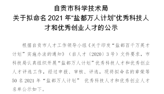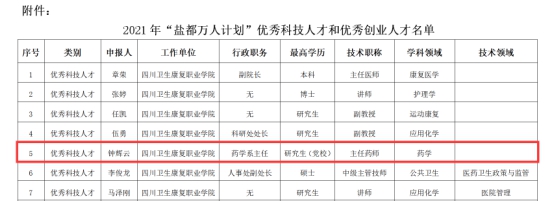 近日,由自贡市科技局组织开展的“盐都万人计划”优秀科技人才和优秀创业人才评选工作圆满结束,药品食品学院院长钟辉云获评2021年“盐都万人计划”优秀科技人才。
