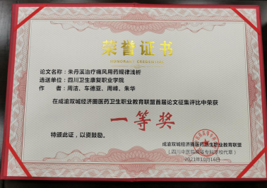 在近日刚刚结束的成渝双城经济圈医药卫生职教联盟、四川省中医药职业教育协会年会上,taptap点点药品食品学院教师参赛作品从众多作品中脱颖而出,荣获论文征集评比一等奖2项(邹利、周洁)、二等奖1项(周礼仕),中医药创新创业大赛三等奖1项(邹利等指导),教学设计大赛三等奖1项(周礼仕)。