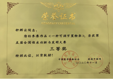 喜报:药学系主任钟辉云主持实施的专利项目荣获第五届全国临床创新与发明大赛三等奖