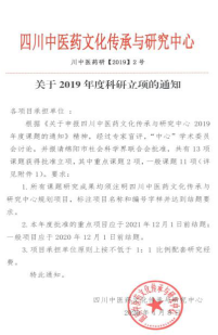 5月26日,接《四川中医药文化传承与研究中心关于2019年度科研立项的通知》(川中医药研【2019】2号),在全省立项的11个课题中,我院立项两个,包括药学系邹利老师主持的“不同僵蚕炮制品的复方面膜的制备研究”和周礼仕老师主持的“基于多糖成分研究葛根与粉葛的差异”,其中邹利老师主持的课题被立项为重点课题(全省共2个)。