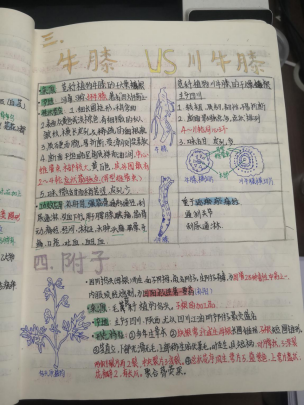 临近期末,看着郑茜老师办公桌上一摞摞写满文字的笔记本等待评阅,办公室的老师都被学生对专业,对课程的热爱深深打动。有些同学图文并茂,将原植物、断面及显微图用简笔画的形式展现出来,层次分明,逻辑清晰,用彩合理;有些同学则能全面的还原课堂重难点,具有很强的笔记梳理能力;有些同学的笔记每一页都是艺术品,从字里行间能够感受到是用文艺的心在做笔记。