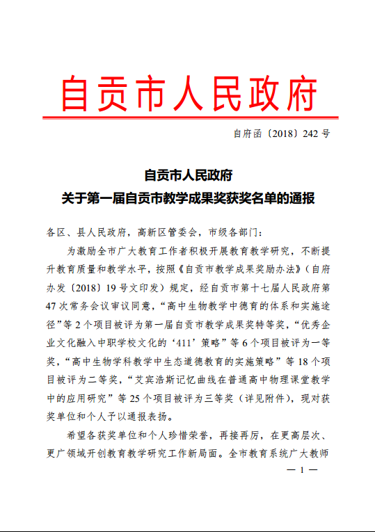 日前,自贡市人民政府举办的“第一届自贡市教学成果奖”评审工作圆满结束。据《自贡市人民政府关于第一届自贡市教学成果奖获奖名单的通报(自府函〔2018〕242号)》文件通知,我院药学系钟辉云主任主持的科研课题成果《模拟药房在培养高素质中高职药学专业人才中的应用策略》荣获自贡市人民政府第一届教学成果奖二等奖。