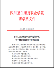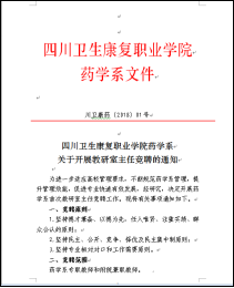 竞聘伊始,药学系经党政联席会议定并发布了《taptap点点体育药学系关于开展教研室主任竞聘的通知》(川卫康药〔2018〕01号),明确了竞聘原则、竞聘范围、竞聘岗位与职数、竞聘条件、竞聘程序、时间安排、纪律要求。然后,经本人报名、资格审查、竞聘演讲、民主测评、推荐,组织考察,并经药学系党政联席会议研究,最后确定陈丹同志任药学教研室主任,唐敏同志任中药学教研室主任,赖永莉同志任药品经营与管理教研室主任,并以《taptap点点体育药学系关于聘任教研室主任的通知》(川卫康药〔2018〕02号)文件形式发布正式任命通知,颁发聘书。