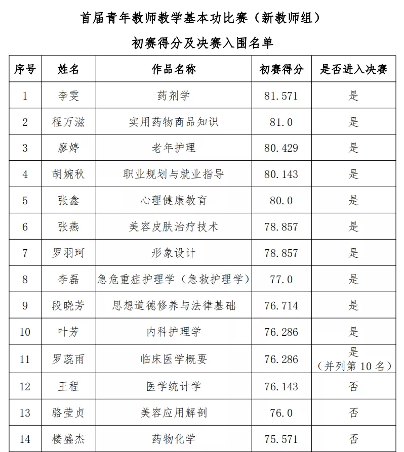 在刚刚结束的学院首届青年教师(新教师组)教学基本功比赛初赛中,药学系新教师李雯、程万滋表现优秀,在全校39名参赛选手中脱颖而出,分获全校第1名和第2名。特此报喜,并希望他们再接再厉,在决赛中再创佳绩。