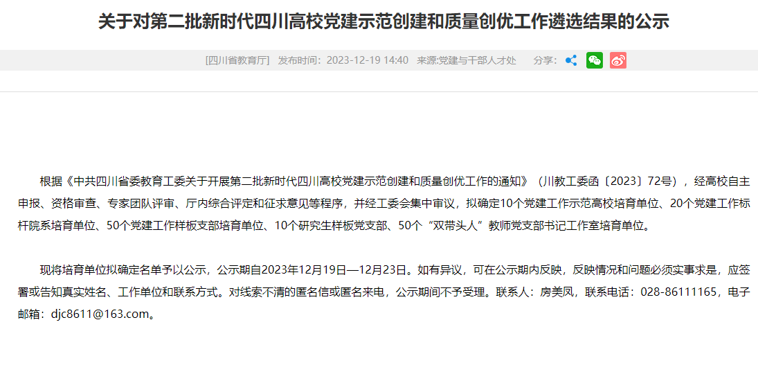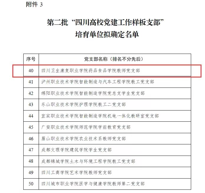 近日四川省教育厅近期对第二批新时代四川高校党建示范创建和质量创优工作遴选结果进行了公示,药品食品学院教师党支部入选第二批“四川高校党建工作样板支部”培育单位(全省共50个)。特此报喜。