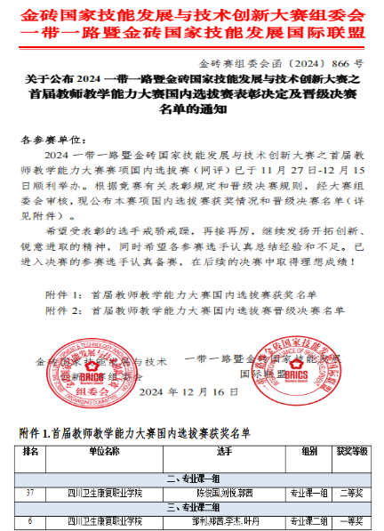 12月16日,一带一路暨金砖国家技能发展与技术创新大赛之首届教师教学能力大赛国内选拔赛获奖名单及进入国际总决赛名单公布,taptap点点药品食品学院两个团队获奖,其中邹利、郑茜、李杰、叶丹团队荣获专业二组一等奖并进入国际总决赛,陈俊国、刘悦、郭茜团队荣获专业一组二等奖。此次比赛参赛团队积极备战、不畏挑战、勇攀高峰,充分展示了taptap点点的教学实力与水平。为学校的“双高”建设发展再创佳绩。