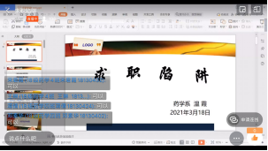 3月11日,药学系副主任杨光丽通过钉钉直播开展“药学生就业形势及政策分析”专题讲座。杨主任以“你想做的工作真的适合你吗?”话题开场,引发学生热议和思考,进而从自我认识、药学生就业环境、专升本政策、就业策略等方面开展分析和指导,为同学们理清了应届毕业生主动适应就业市场,提高求职成功率的思路和方法。在互动环节,几名在实习中表现优异的同学作了交流发言,从自身发展和岗位需求的角度分享了自己的经验体会,为其他同学提供了就业参考方向。