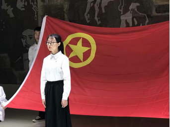 接着,同学们来到纪念碑前,21米高的纪念碑庄严肃穆,碑体似一双巨手,带着圣洁的光辉,伸向万里长空,遥祭英烈忠魂。在陈列馆,钟辉云主任为同学们上了一堂生动的实地团课,他带领同学们重温五四运动百年历史,号召广大同学要继承革命先烈的革命精神,为中华民族伟大复兴不懈奋斗。优秀团员代表杨玉婷同学在团旗下作了“弘扬五四精神,争做时代新人”的主题演讲。随后,同学们一起重温了入团誓词、共唱共青团团歌。最后,同学们纷纷写下自己的活动感悟和今后的奋斗目标,表示作为新时代青年,要立鸿鹄志,为祖国建设贡献自己的青春力量。
