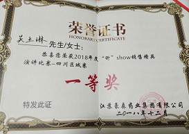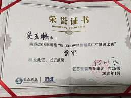 taptap点点首届“豪森医药班”、16级药学1班学生吴玉琳,在江苏豪森药业集团有限公司举办的“昕show销售精英演讲比赛”――四川区域赛中荣获一等奖,在集团总部决赛中荣获“季军”。