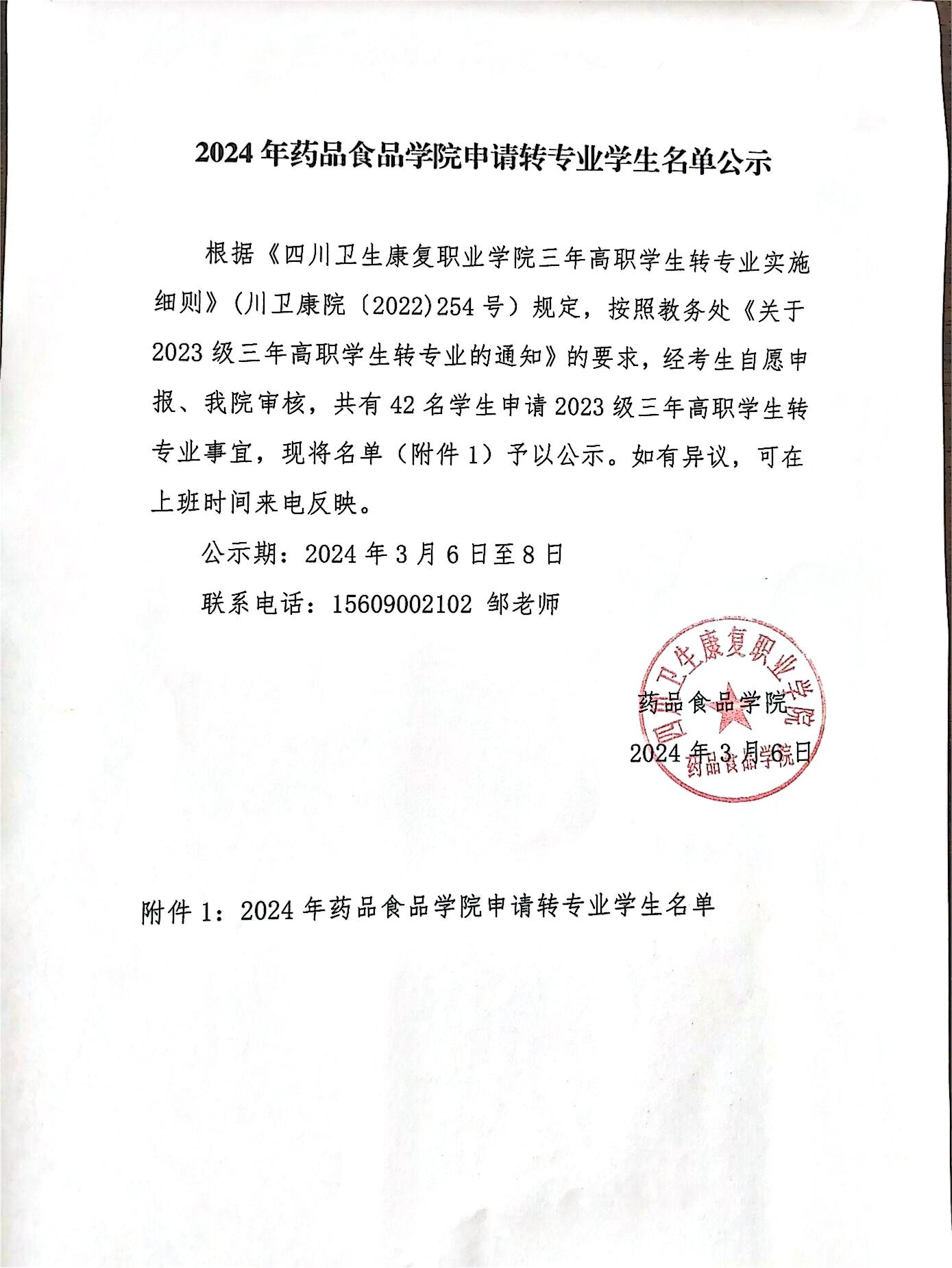 2024年药品食品学院申请转专业学生名单公示