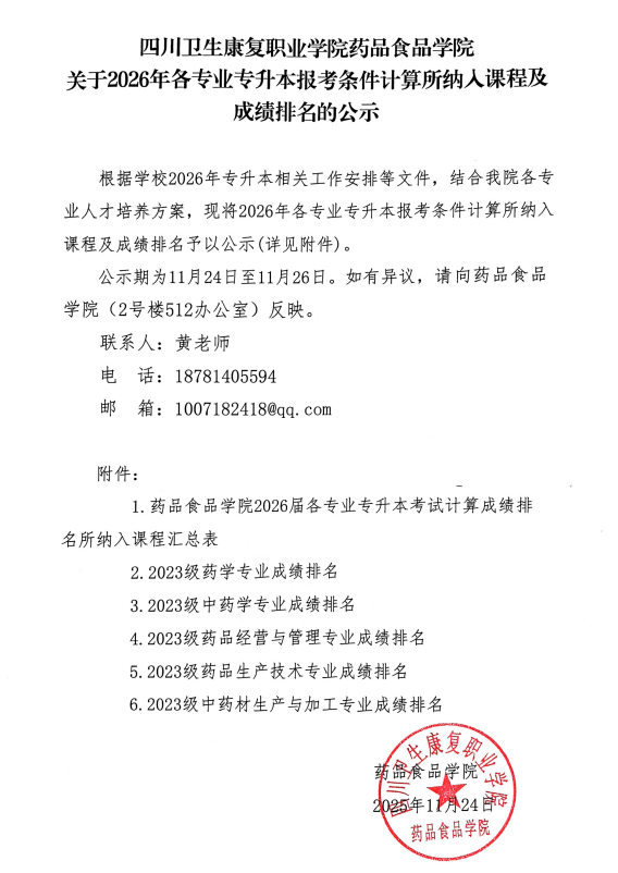 taptap点点体育药品食品学院关于2026年各专业专升本报考条件计算所纳入课程及成绩排名的公示