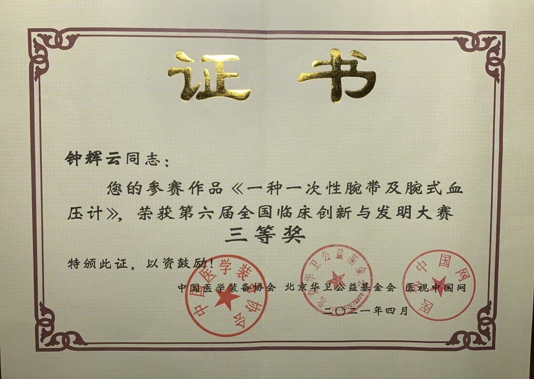 今日,在上海复旦大学附属中山医院举行的“第六届全国临床创新与发明大赛”春季赛及颁奖典礼上,学院药学系主任钟辉云的参赛作品《一种一次性腕带及腕式血压计》,荣获医疗组三等奖(全国仅20人获此殊荣)。