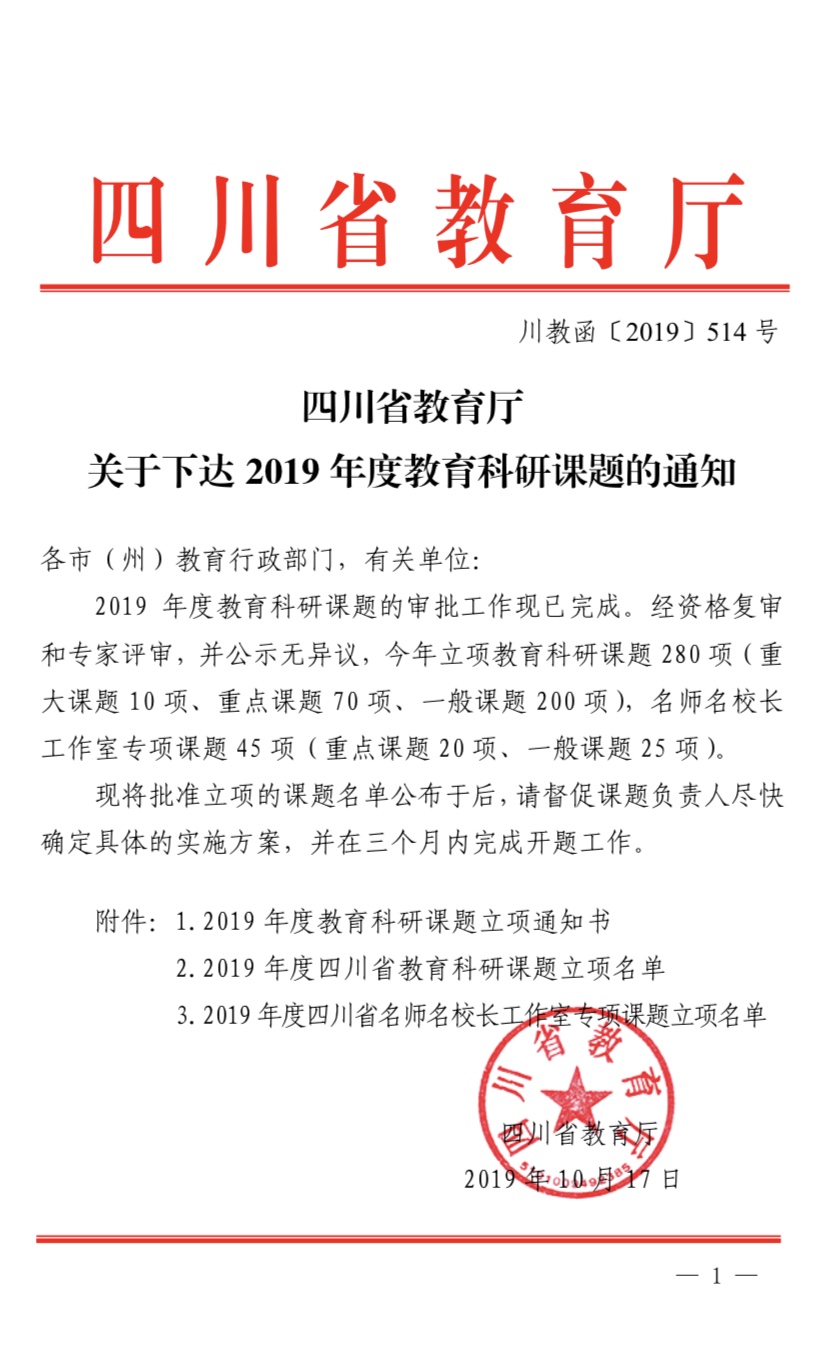 10月17日,接《四川省教育厅关于下达 2019 年度教育科研课题的通知》(川教函〔2019〕514 号),药学系主任钟辉云主持的科研课题《校企联合精准培养高职药学亚专业方向人才实践研究》成功立项。