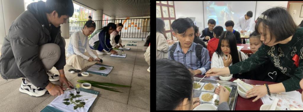 参观完后,讲解员带着留学生体验了药用植物拓染和制作香囊等活动。留学生们选取不同颜色、不同种类的药用植物,在棉布上敲出一幅幅五彩斑斓的画;将吴茱萸、艾叶、薄荷等草药放入研钵,充分研磨后装入香囊。