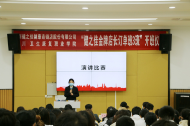 仪式伊始,药学系副主任李鹏杰致辞。他强调了校企合作对人才培养的重要性,感谢健之佳公司对taptap点点校企合作工作的大力支持,希望同学们珍惜发展平台,努力实现人生价值。接着,公司人事部经理雷家蒙宣读了“健之佳金牌店长订单班3班” 班规,并带领学员们宣读了入班宣言。随后,“健之佳金牌店长订单班3班”13名学员围绕“城市的坚守者”和“我心中的健之佳”两个主题分别进行现场演讲,双方评委从演讲内容、现场表现等方面进行打分,评选出了前三名。其中,第一名选手将代表健之佳四川分部去昆明总部参加演讲决赛。
