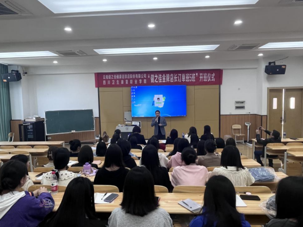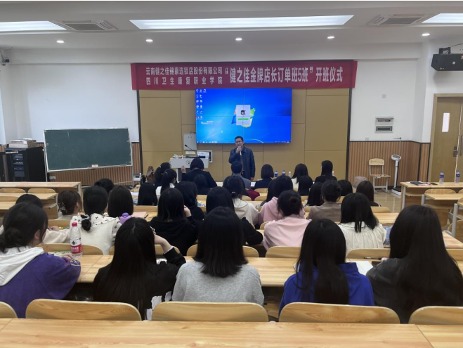 3月22日下午,“健之佳金牌店长订单班5班”开班仪式在1教B405举行。健之佳全国人力资源中心总监冯宇、全国人才开发经理张婷、四川分部人事部经理薛艳一行六人,药品食品学院院长钟辉云,副院长杨光丽、2023届订单班学生参加了本次开班仪式。