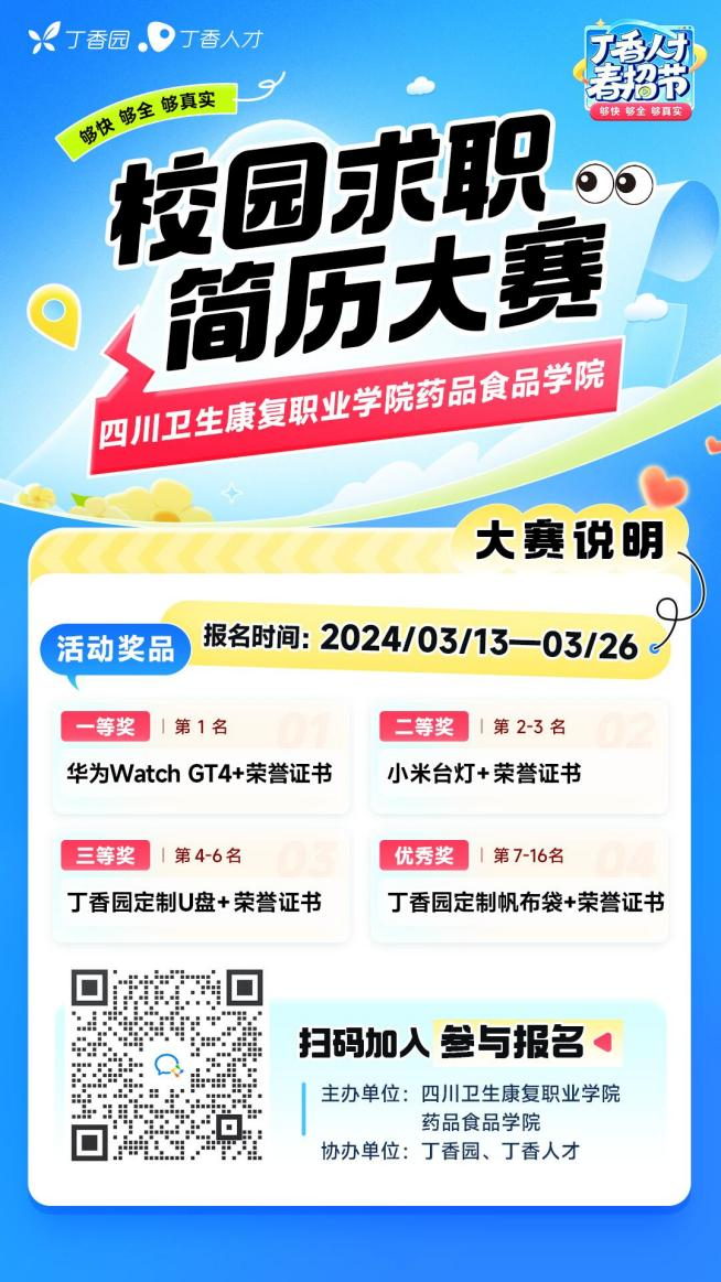参赛对象为taptap点点体育药品食品学院全体学生。比赛时间和流程:报名环节(3月13日-3月26日)、初赛选拔(3月27日-3月29日)、决赛环节(4月中旬)。报名参赛的同学通过群二维码扫码进入本次大赛专属社群,社群助手定期发布大赛报名二维码在丁香人才平台提交参赛简历。提交方式:上传PDF简历/手动定制个性化简历。