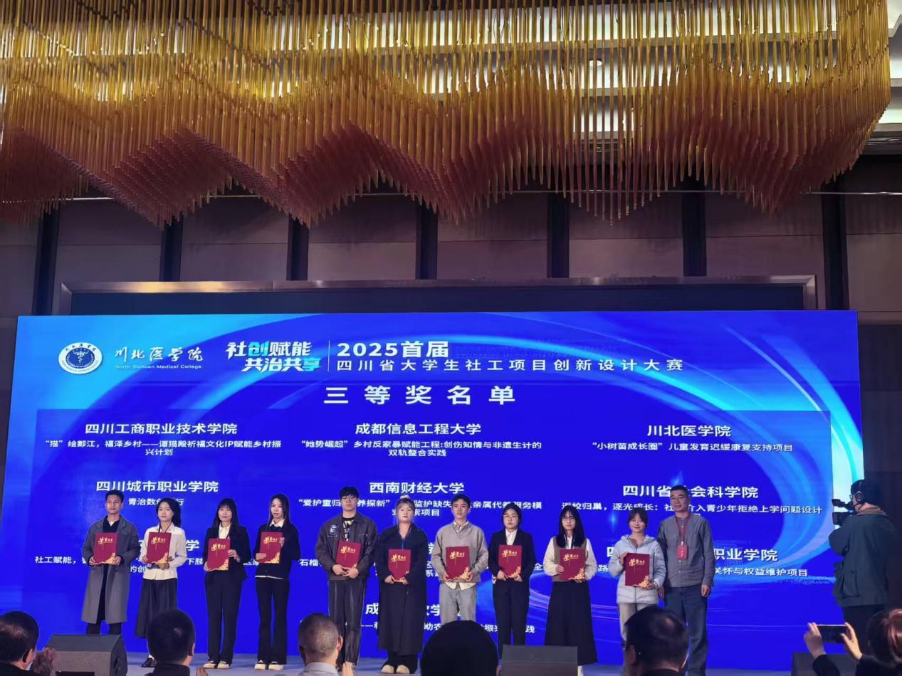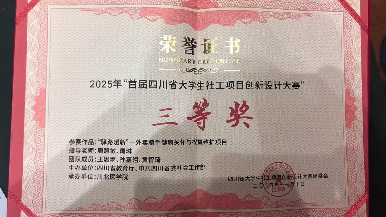 11月10日,我院在四川省教育厅、中共四川省委社会工作部主办、川北医学院承办的2025年首届四川省大学生社工项目创新设计大赛中,由周慧敏老师、行业指导周琳老师指导的项目《驿路暖新—外卖骑手健康关怀与权益维护项目》获得三等奖。