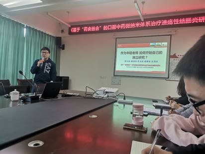 5月18日下午,高飞博士在2教学楼A514举办了“基于‘药食结合’的口服中药微纳米体系治疗溃疡性结肠炎研究”专题讲座,帮助我院教职工明确科研选题方向,理清研究思路,启发教师的科研思维。高飞博士首先以“作为年轻老师,如何开始自己的独立研究?”为引,指出教师做科研应有独立性、独特性、学术性、前瞻性和应用性。随后,从研究背景介绍、研究成果分享、研究计划展望、研究问题探讨四个方面对基于“药食结合”的口服中药微纳米体系治疗溃疡性结肠炎研究情况、研究过程及研究结果进行了详细的阐述。最后,高飞博士与参加讲座人员针对科研方向、科研经验、论文撰写技巧、核心期刊投稿心得等方面进行了交流和讨论。