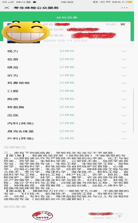 考生不再到生源地招办或原学校复印高考体检表,可通过微信关注公众号“招生考试信息网ZK789”,在“高考体检信息查询”功能中,输入考生号、身份证号、姓名登录,查询自己的体检结果数据及受限代码相关限制提示并截屏打印。考生现场确认时通过手机出示查询体检结果及提交打印件(见模版)。